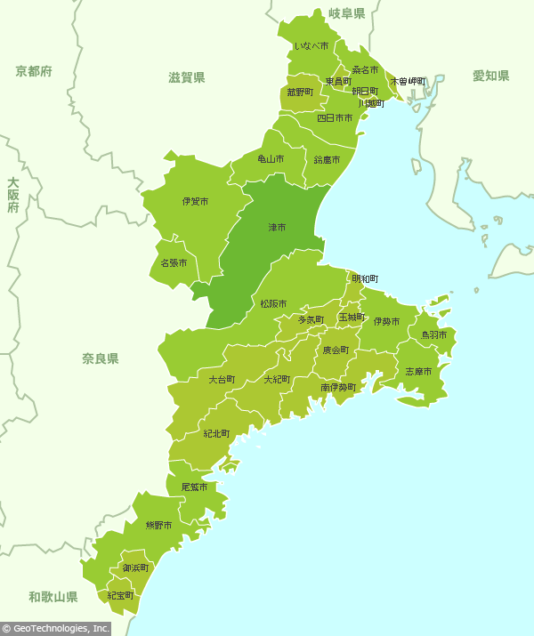 津市|四日市市|鈴鹿市|松阪市|桑名市|伊勢市|伊賀市|名張市|鳥羽市|亀山市|いなべ市|志摩市|尾鷲市|熊野市|東員町|菰野町|朝日町|川越町|木曽岬町|多気町|明和町|大台町|玉城町|度会町|大紀町|南伊勢町|紀北町|御浜町|紀宝町など。