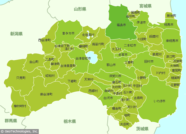 【町・村】 桑折町|国見町|川俣町|大玉村|鏡石町|天栄村|下郷町|檜枝岐村|只見町|南会津町|北塩原村|西会津町|磐梯町|猪苗代町|会津坂下町|湯川村|柳津町|三島町|金山町|昭和村|会津美里町|西郷村|泉崎村|中島村|矢吹町|棚倉町|矢祭町|塙町|鮫川村|石川町|玉川村|平田村|浅川町|古殿町|三春町|小野町|広野町|楢葉町|富岡町|川内村|大熊町|双葉町|浪江町|葛尾村|新地町|飯舘村