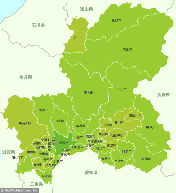 岐阜市|大垣市|高山市|多治見市|関市|中津川市|美濃市|瑞浪市|羽島市|恵那市|美濃加茂市|土岐市|各務原市|可児市|山県市|瑞穂市|飛騨市|本巣市|郡上市|下呂市|海津市|岐南町|笠松町|養老町|垂井町|関ケ原町|神戸町|輪之内町|安八町|揖斐川町|大野町|池田町|北方町|坂祝町|富加町|川辺町|七宗町|八百津町|白川町|東白川村|御嵩町|白川村など。
